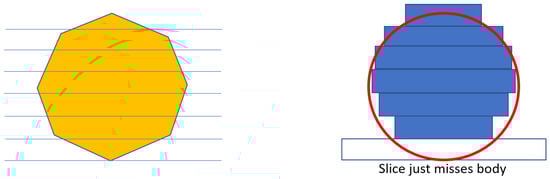 The first step is to use the real geometry of the parts, rather than an approximation. This also leads to problems in obtaining the desired shape. The slicing problems are illustrated in Figure 5 and Figure 6. A common characteristic in both Figure 5 and Figure 6 is that the made shape lies inside the desired shape as the object expands and outside when the object is contracting, as indicated when comparing the red rings with the slices in both figures. In Figure 5, there is a representation of what might happen with a sphere. The right-hand side of the figure shows what might be the sections, the red ring indicates the shape intended. As with the approximated shape in Figure 5, the first section misses the body, since the intersection is at a single point. This means that the shape made is slightly higher than the desired shape. The yellow shape on the left represents a cross section through a sphere approximated by triangular facets.