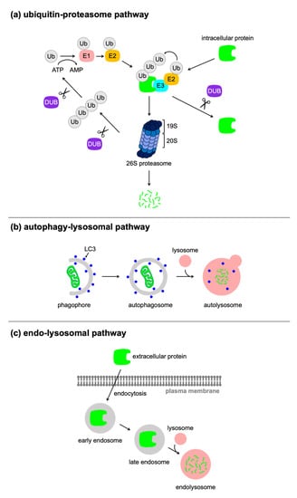 In contrast to the ubiquitin–proteasome pathway, the autophagy–lysosome pathway is capable of targeting not only proteins, but also cellular organelles []. The substrates are enclosed by an isolation membrane (called phagophore) which associate with the microtubule-associated protein light chain 3 (LC3) on their surface (Figure 1b). After its subsequent maturation and closure, the autophagosome is formed. The outer membrane of the autophagosome fuses with the lysosome, and the internal materials are degraded in the autolysosome. Although these processes are called “bulk” degradation system, autophagy mediates the selective degradation of substrate proteins and/or organelles through autophagy receptors, such as p62. These receptor proteins contain the LC3-interacting region, which mediates their binding to nascent autophagosomes. The receptors also recognize the ubiquitinated substrates through an ubiquitin-binding domain and recruit them to the autophagosome, resulting in selective degradation by the lysosomes. Furthermore, there is another kind of degradation machinery of lysosomes that can target extracellular and plasma membrane proteins via endocytosis (Figure 1c). After endocytosis, internalized extracellular and plasma membrane proteins enter the early endosome. The early endosome matures into the late endosome, which then fuses with the lysosome to form an endolysosome, within which the internal materials are degraded.