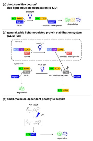 Light-switchable degrons. Concepts of (a) photosensitive degron and B-LID, (b) generalizable light-modulated protein stabilization system (GLIMPSe), and (c) small-molecule-dependent photolytic peptide.