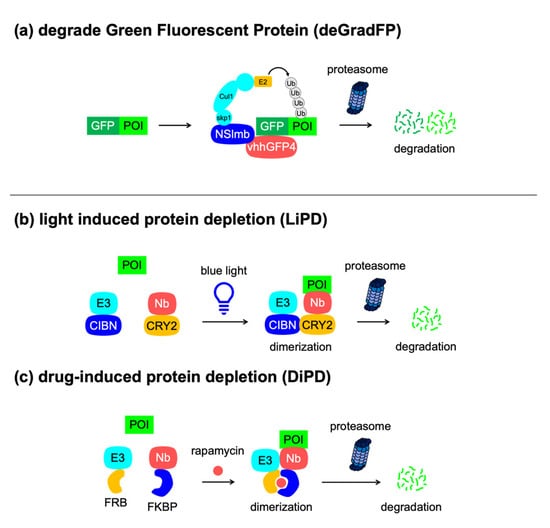 Recently, Deng et al. developed alternative nanobody-based approaches to control endogenous molecules in cells and organisms via light- or drug-induced protein depletion (LiPD or DiPD, respectively) []. These systems comprise two recombinant elements, i.e., the E3 ligase and the nanobody (or DARPin) that target the POI. The two proteins are conjugated with heterodimerization tags, such as cryptochrome 2 (CRY2) and CIBN, thus allowing light-induced heterodimerization between the two fusion proteins (Figure 5b). This brings together the nanobody-bound POI and the E3 Ub ligase, thus triggering ubiquitination and degradation of the target protein. The RING domain of the E3 Ub ligase and nanobody for POIs can also be fused to FRB and FKBP12, respectively. Upon addition of rapamycin, FRB and FKBP12 heterodimerize, which leads to the ubiquitination and degradation of the POIs (Figure 5c).