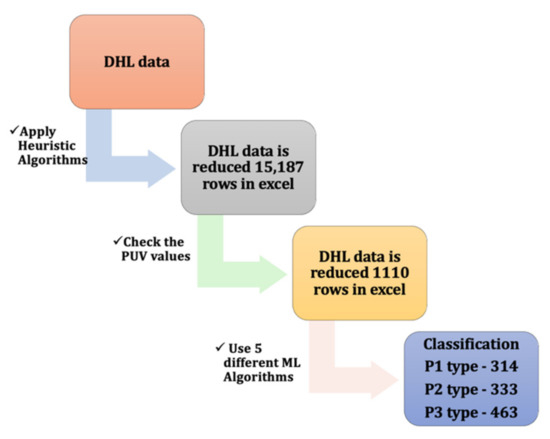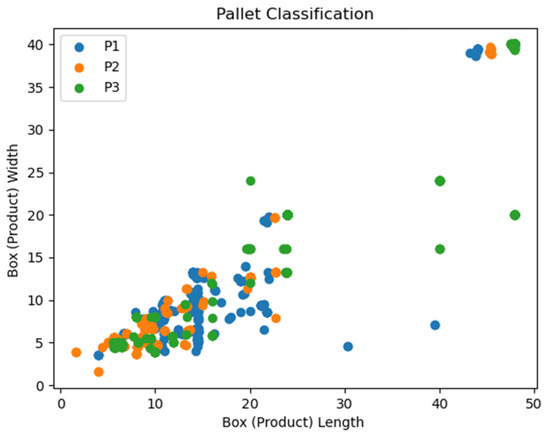In this paper, the dataset comprised 15,187 data points, which contained various types of boxes and pallet-sizes. This dataset was used for the training and testing of different models, which utilized the aforementioned five heuristic algorithms to place the boxes on pallets according to their variable lengths, heights, and widths to obtain optimal results for their arrangements. This dataset is available as listed within an Excel file. The pre-processing of the dataset was first performed by data filtering to create a meaningful classification and eliminate unnecessary data points. The pre-processed dataset is extremely important for the proper training and testing process of the ML models. For instance, from this dataset, the data in accordance with the most commonly-used standard pallet sizes 42 × 42 (P1), 45 × 45 (P2), and 48 × 40 (P3) were selected for training and testing. Thus, our algorithm is applicable only for the P1, P2, and P3 pallet sizes, with only approximately 1 in 15 instances being further considered. While selecting these data, the PUV (pallet utilization volume) ratio for both the P1 and P2 pallet sizes was 85%, and the PUV ratio for the P3 pallet was 95% or above. Thus, a total of 1110 data points were finalized, with 314 for the P1 pallets, 333 for the P2 pallets, and 463 for the P3 pallets. Table 2 presents the dataset details used in this research study.