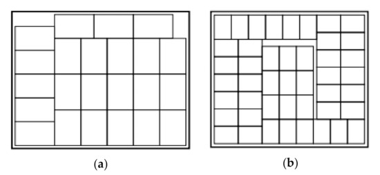 In the three-block and five-block heuristics, the layout of the layer is divided into three and five blocks, respectively (Figure 3). The boxes in each block should be arranged uniformly in either an H-box or V-box orientation [31,36].