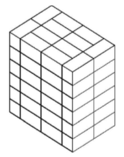 In the one-block heuristic, the boxes are loaded in either H-box or V-box orientation on the basis of the ratio between the dimensions of the pallet and boxes without any overhang. For example, identical boxes with known dimensions are loaded onto the pallet; is a dimension perpendicular to the surface of the pallet, as depicted in Figure 2. If where the length of the boxes is parallel to the length of the pallet, then the horizontal layout pattern for the boxes in this layer is known as the H-box pattern; otherwise, if the length of the box is parallel to the width of the pallet, the box vertical layout pattern is known as the V-box pattern. All boxes in the layer should be loaded into the layer in the uniform orientation, which means that all boxes must have either an H-box or V-box layout. There are also three possibilities to load the boxes in the layer, where either is perpendicular to the surface of the pallet.