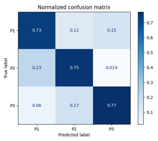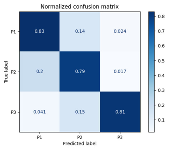 In Figure 7, the Confusion Matrix for the ANN classifier is presented. It can be observed that the ANN classifier correctly classified 83% of the P1 classes, 79% of the P2 classes, and 81% of the P3 classes.