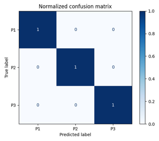 In Figure 10, the Confusion Matrix for the Random Forest classifier is shown. It can be observed that this classifier managed to predict 100% of classes P1, P2, and P3.