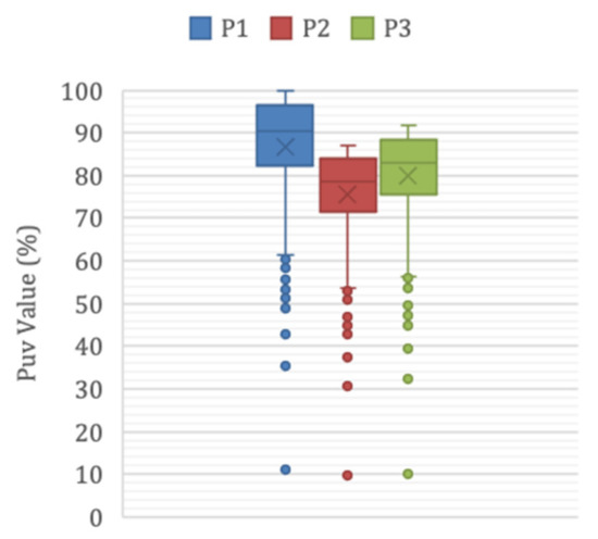 According to Figure 12, average PUV values in P1, P2, and P3 were 90.31, 78.67, and 82.97, respectively.