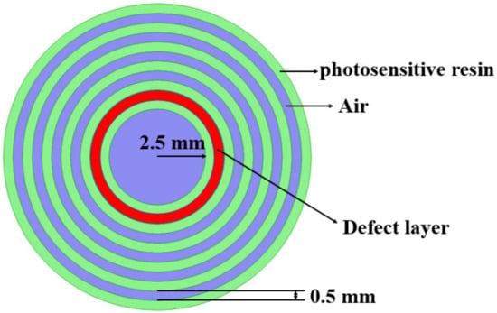 where and are RI of the defect layer and photosensitive resin, and are the corresponding thicknesses, and is RI of the core material. In this paper, the core material is air ( = 1).