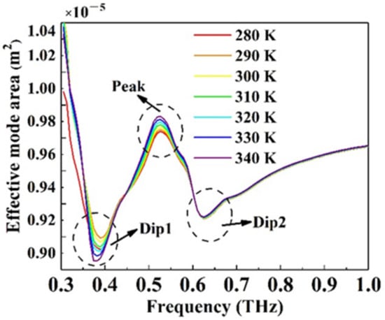 where is the electric field density distribution obtained by the eigenvalue for solving Maxwell’s equations. Figure 4 shows the effective mode area with water at different temperatures. The effective mode area takes on two dips at about 0.38 THz and 0.62 THz, respectively. Dip1 and the peak of the effective modal area are formed by the transverse resonant coupling between core modes and defect modes. Dip2 is formed by the Bragg resonant. The more leakage of the THz wave into the cladding region produces a larger effective mode area. With the temperature of water rising from 280 K to 340 K, the dip1 of the effective mode area decreases from 280 K to 340 K; in contrast, the peak from 280 K to 340 K.