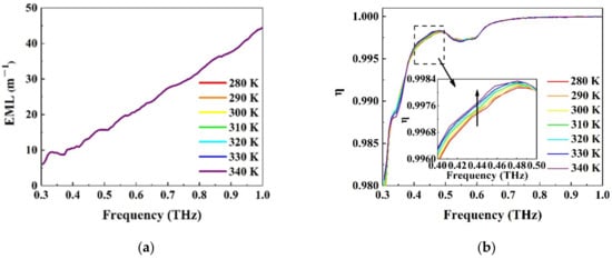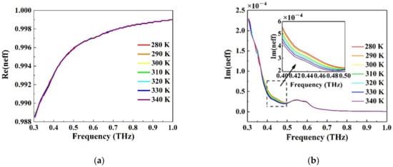 The effective RI of the fundamental mode in the proposed fiber is shown in Figure 5. The real part of the effective RI of the proposed fiber is almost the same, from 280 K to 340 K. As shown in Figure 5b, in the range of the lower frequency, the imaginary part of effective RI decreases with increased frequency. The inset of Figure 5b shows that, with the frequency range of 0.4 THz to 0.5 THz, it displays a temperature effect.