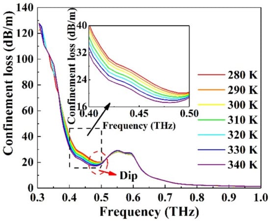 where is the imaginary of the effective RI. The confinement loss is shown in Figure 7. It can be observed that a lower confinement loss can be obtained at a frequency of more than 0.4 THz. The inset of Figure 7 shows that the frequency range of 0.4 THz to 0.5 THz exhibits an obvious temperature dependence. The THz wave tends to propagate through materials with a higher RI, and water at high temperatures has a high RI, which causes the lower confinement loss.