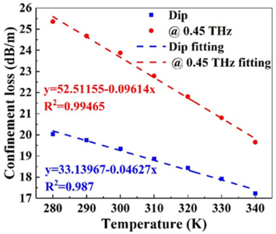 With an increase in the temperature of liquid water, the change trends of the confinement loss at the dip and at 0.45 THz frequency are shown in Figure 8, respectively. The symbols are the simulated data, and the dotted lines are the linear fitting curves. It is apparent that the confinement loss at the dip and at 0.45 THz are both in linear inverse proportion to the temperature. The temperature sensitivity is obtained at 0.09614 dB·m−1/K at 0.45 THz, and the coefficient of determination reaches 0.99465.