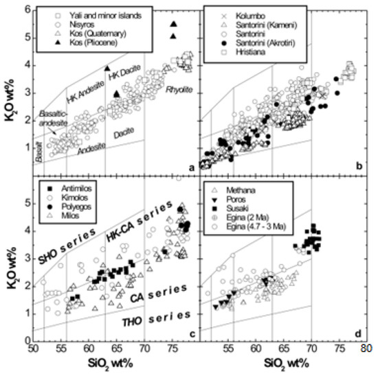 K2O versus silica classification diagrams [4] for (a) Nisyros group (b) Santorini group (c) Melos group and (d) Methana group.