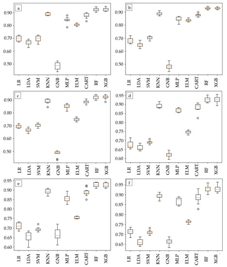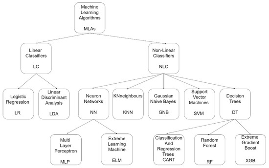 Of the linear algorithms, Logistic Regression (LR) [24] and Linear Discriminant Analysis (LDA) [25] were used. The non-linear algorithms tested were k-Nearest Neighbor (kNN) [26], Gaussian Naive Bayes (GNB) [27], and Support Vector Machine (SVM) [28]. Furthermore, Multi-Layer Perceptron (MLP) [29,30] and Extreme Learning Machine (ELM) [31,32] belonging to the Neural Network Group were evaluated. Finally, decision trees were tested, namely Classification and Regression Trees (CART) [33], Random Forest (RF) [34,35,36], and Extreme Gradient Boost (XGB) [37,38].