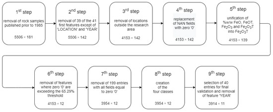 A collection of volcanic rock geochemical data, covering the active volcanic regions (4) of the HVA and most non-active pre-Pliocene volcanic regions (32) of Greece, was retrieved from the GEOROC database [10]. The initial dataset provided consists of 6229 entries containing 181 features. The first 41 features are descriptive and cover general information about the rock samples. Most notable is the year of publication of the rock sample data and the sampling location. Initially, data reduction was performed using the Python libraries Pandas [40] and Numpy [41] in nine sequential steps (Figure 4). In the first step, all rock sample entries published before 1985 [12] were deleted because analytical methods—the way the chemical composition was analyzed—prior to this year are considered unreliable. This resulted in a new data matrix with the dimensions of 5506 × 181. In the second step, 39 of the first 41 features were deleted. The ‘LOCATION’ feature was preserved, as it was essential for creating the classes in the eighth step. The ‘CITATION’ feature was used to select the validation data in the ninth step. In this way, the data matrix was reduced to 5506 × 142. The first feature represents the location and the second represents the scientific paper where the sample’s chemical composition was published, while the other 140 features contain the geochemical data of the rock samples. The chemical composition is expressed was the mass fraction (wt%) of the major elements, trace elements in parts per million (ppm) or parts per billion (ppb), and isotopes as ratios. In the third step, locations outside the research area were deleted, resulting in a 4153 × 142 data matrix.