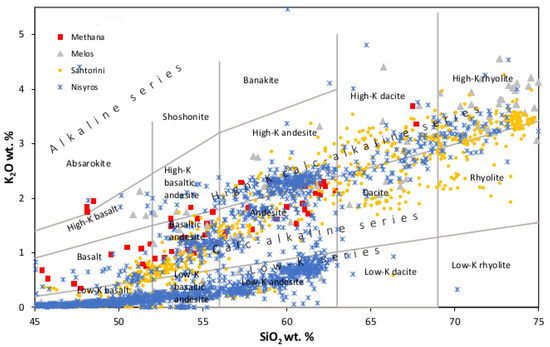 The Hellenic Volcanic Arc (HVA) in Southern Greece consists of four volcanic regions (Figure 1), namely the Methana region, which includes Methana, Aigina, and Poros in the west; the Melos region, consisting of Melos, Antimelos, and Kimolos in the southwest; the Santorini region, consisting of Santorini, Kolumbus, and Christianoi in the southeast; and the Nisyros region consisting of Nisyros, Giali, and Pergousa in the east. All active volcanoes of the HVA were formed by a converging tectonic setting, producing Island Arc Basalts (IABs) belonging to the calc-alkaline and high-K calc-alkaline series. The first activity took place during the Pliocene (5 m.y.) and continues to the present day [1,2,3]. The extent of the HVA is well-mapped on the surface [1], but little is known about its extent under the seafloor. A large part of the HVA is buried under the sediments of the Southern Aegean Sea. Future deep-sea drilling for mineral prospecting will provide rock samples to produce more precise geological borders for the HVA. In order for these rock samples to be used for mapping, they have to be correlated to one of the four active volcanic regions. Furthermore, volcanic tocks from the HVA have been used to produce artifacts like millstones and anchors from prehistoric times. These artifacts can be found scattered all around the Mediterranean. One of the questions about these artifacts in archaeology is the source of the original material. By answering that question, ancient trade routes can be revealed.