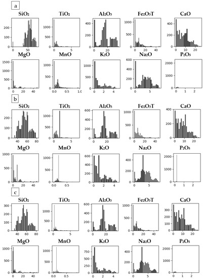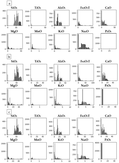 Following data reduction, six datasets (All datasets are available upon request) were created. The initial dataset was labeled Dataset 1 and consisted of 3914 entries and 11 features. The first 10 features were the geochemical data of the major elements and the last was the class. A snapshot of Dataset 1, the initial dataset, is shown in Table 1. These 3914 data samples were used to plot SiO2 vs. K2O [42] (Figure 5) and SiO2 vs. Na2O + K2O [43] (Figure 6) to check if the four volcanic regions could be discriminated by the use of this bigger dataset. The diagrams show that this was not the case, as major overlapping of the sample points was present. In Dataset 2, the zeroes were replaced by the mean value. In Dataset 3, the zeroes were replaced by the median. Datasets 4–6 were created from Datasets 1–3 correspondingly by deleting the outliers. The outliers were removed by using the stats class of the Scipy library and the Numpy library. The number of entries of each class in every dataset is shown in Table 2. The basic statistic data of Datasets 1–6 are presented in Table 3, Table 4, Table 5, Table 6, Table 7 and Table 8. The histograms of Datasets 1–3 with outliers are depicted in Figure 7. The histograms of Datasets 4–6 with the outliers removed are depicted in Figure 8. The histogram of Dataset 5 shows the best distribution of the data.