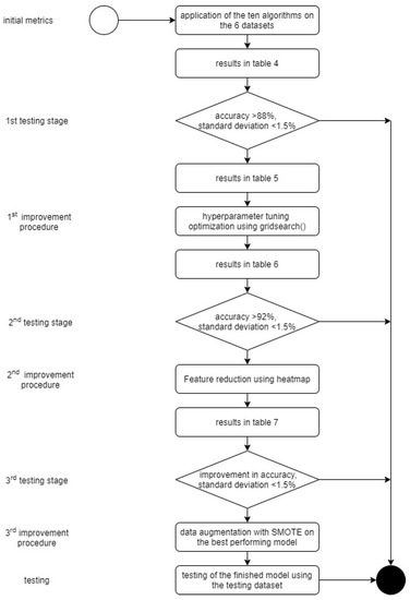 The training of the models was implemented using Python 3.8 (Guido van Rossum, The Hague, The Netherlands) [44] joint with Scikit-learn (David Cournapeau, Paris, France) [45], the xGboost wrapper for Scikit-learn(https://xgboost.readthedocs.io/, accessed on 30 June 2021) and elm.ELM Kernel (Augusto Almeida, Brazil). The goal was to create the most accurate model, with the smallest standard deviation and the least computing time, by using one out of the 10 MLAs and one of the six datasets. Training of the model was conducted on a Windows 10 System with an Intel Core 2 Quad Q8400 CPU and 8 GB of RAM. Tenfold cross-validation was applied (i.e., the original sample was randomly partitioned into 10 equal size subsamples). The datasets were split randomly into 70% training data and 30% testing data. In this way, the experiments were repeated 10 times by using 10 different versions of the dataset. Finally, three stages of testing and three improvement procedures were applied (Figure 9).
