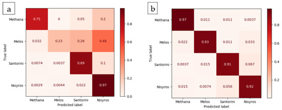 In the third improvement procedure, a confusion matrix was created for Model 6 to evaluate the accuracy of each class (Figure 11a). The low prediction accuracy results of Melos can be explained if we take into account that an extremely imbalanced dataset was used: 132 entries for Methana, 104 for Melos, 906 for Santorini, and 2263 for Nisyros (Table 2).
