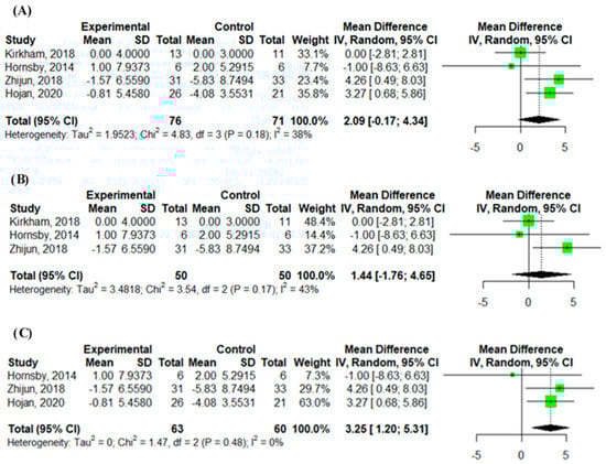 Forest plot showing the effect of exercise intervention compared to control on resting left ventricular ejection fraction: (A) from the included trials; (B) from the trials conducted during anthracycline-containing therapy; (C) from the trials that implemented interventions involving ≥36 exercise sessions.