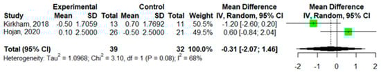Kirkham et al. [] reported data for left ventricular longitudinal strain and Hojan et al. [] analyzed global longitudinal strain (GLS). Pooled data demonstrated no differences (MD: −0.31%; 95% CI: −2.07 to 1.46; I2 = 68%; Figure 4). Kirkham et al. [] also presented data on left ventricular twist but it was observed a null effect (MD: 0.12°; 95% CI: −0.1 to 0.35).