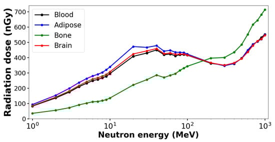 When we considered neutrons with a flat spectra (5 × 10 neutrons for each energy) and as a reference the RD deposited by them in the bone tissue sample, we found that in the range of energies from 1 to 100 MeV, the RD deposited in the blood, adipose and brain tissue samples is greater by 67.9%, 82.8% and 72.3% respectively. On the other hand, for the range of energies between 200 and 1000 MeV, the RD deposited in the blood, adipose and brain tissue samples is lower by 19.0%, 19.2% and 19.5% respectively.