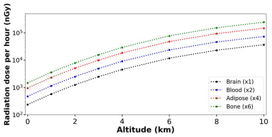 Figure 4, we can see that the RD deposited in the tissue samples is minimal at sea level and increases with height, the reason for this is that the neutron flux increases with increasing height. All curves have the same behavior. From the data obtained from the simulation and considering as reference the RD deposited by neutrons at 0 km above sea level, for an altitude of 4 km, corresponding approximately to an altitude of high mountain, the RD is increased ∼19 times, while, for an altitude of 10 km, corresponding to an altitude of commercial flights, the RD is increased ∼156 times.
