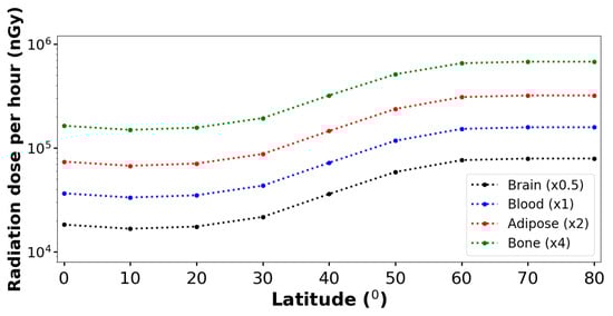 11]; we calculated the RD deposited by these particles in different human tissues as a function of both altitude and latitude and for a longitude of 0