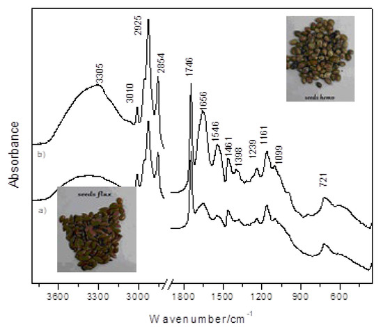 Both spectra for flax and hemp showed the typical carbonyl band at 1746 cm−1 and those of hydrogen/carbon bond (alkene, alkane) stretch in the region 2700–3010 cm−1, which were obviously dominant in the hemp sample and progressively less intense in the flax sample. The spectra seeds presented a band typical of the protein amide I due to C=O stretching vibration at 1656 cm−1, and this band is more evident in the spectrum obtained from hemp [37].