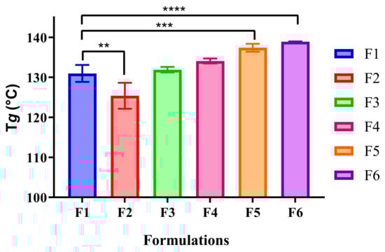 The Tg of p(HEMA) (control (F1), F2, F3, F4, F5, and F6). Values present the average mean ± SD, n = 3., ** p < 0.01, *** p < 0.001, and **** p < 0.0001 significant difference between formulations.