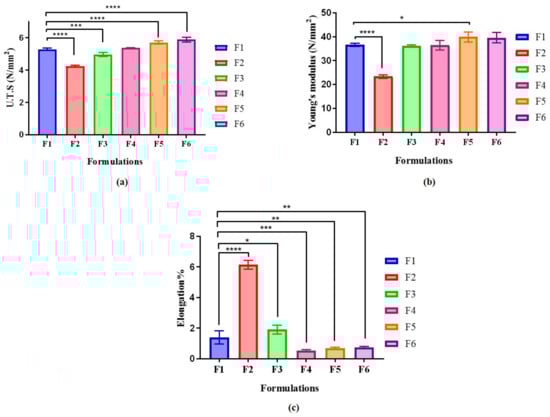 Mechanical properties of dried films of p(HEMA) and drugs-loaded p(HEMA) detected by Texture Analyzer. (a) U.T.S. N/mm2, (b) Young’s modulus (N/mm2) and (c) Elongation%.: Values shown presenting average mean ± SD, n = 3. * p < 0.05, ** p < 0.01, *** p < 0.001, and **** p < 0.0001, a significant difference between formulations.
