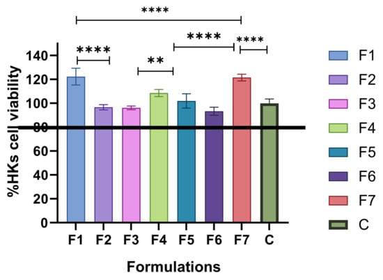 Cell viability of p(HEMA) hydrogel as control (C) and the drug -loaded hydrogels. Values shown represent the mean ± SD, n = 5, ** p < 0.01, and **** p < 0.0001, significant difference between formulations. The black lines marks the 80% viability where less than 80% is considered toxic.
