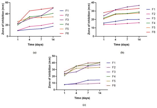 Dried films of AMP, LVX, and different ratios of drug combinations produced zones of inhibition against all tested bacteria, including Gram-positive bacteria such as S. aureus and Gram-negative bacteria such as E. coli and P. aeruginosa, as presented in Figure 4. In general, the size of the inhibition zone increased with time and remained for 14 days. An increase in the inhibition zone with time indicates that those materials would be suitable for long-term catheterization. Indwelling urological devices may be inserted for one day as an intermittent catheter and could be inserted for four months as stents. Thus, the inhibition zone was measured as a function of time. Upon loading p(HEMA) with AMP and LVX, the inhibition zone was influenced by the ratio used. A larger inhibition zone was observed in dried films of p(HEMA) impregnated with 0.5% (w/w) LVX (F3) and p(HEMA) impregnated with 0.125%:0.375% (w/w) AMP: LVX (F6). This is reflected in the spectrum of activity of LVX [34]. The combined antimicrobial agents showed a larger inhibition zone at the initial time intervals compared with each antimicrobial agent alone.