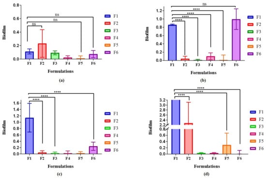 Biofilm-forming ability of p(HEMA) hydrogel formulations and drugs-loaded p(HEMA). (a) The biofilm-forming ability of S. aureus on p(HEMA) hydrogel formulations, (b) biofilm-forming ability of E. coli on p(HEMA) hydrogel formulations, (c) biofilm-forming ability of P. aeruginosa on p(HEMA) hydrogel formulations, and (d) biofilm-forming ability of mixed biofilm on p(HEMA) hydrogel formulations. Values represent the average mean ± SD, n = 3 **** p < 0.0001, significant difference between formulations.