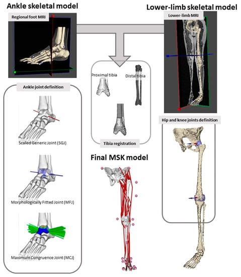 Definition of the personalized MSK model: anatomical information from a regional MRI taken at the foot and a whole lower-limb MRI were merged by registering the segmented tibia bones. Muscle attaching points and marker location with respect to the bones were derived from the lower-limb MRI, while MFJ and MCJ were defined based on detail representation of the ankle articulating surfaces.