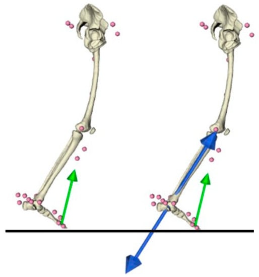 Visualization of difference loading acting on M1 (on the left) and M2 (on the right). Green arrow represents ground reaction force while blues arrows represent internal forces, computed as explained in Section 2.3.