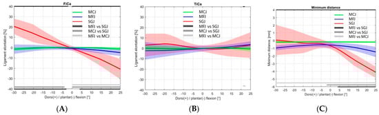 FiCa (A) and TiCa (B) and minimum cartilage-to-cartilage distance (C) values for the average cohort, plotted versus ankle flexion angle for the three ankle models. Bottom gray bars represent the flexion angle values for which post hoc tests were significant.