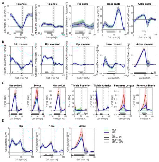 M1 outputs for the average cohort, considering the three ankle models: joint kinematics (A); joint moments (B); forces exerted for significant muscles at the ankle (C); joint contact force (D). Bottom gray bars represent the region of the gait cycle where post hoc tests were significant.