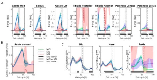 For what concerns muscle forces (Figure 4C), post hoc analysis highlighted significant differences mostly attributable to the M1SG, i.e., Medial Gastrocnemius, Soleus, Lateral Gastrocnemius muscles, during stance and late swing. Peronei muscles presented differences between each of the three models during mid-and late stance.