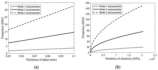 Frequencies calculated as a function of (a) the plate thickness and (b) Young’s modulus for the first three axisymmetric modes.