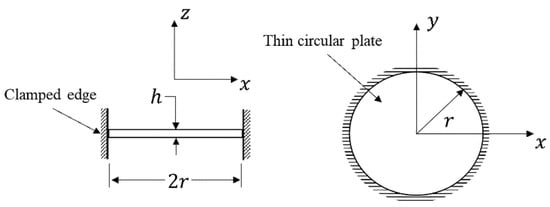 It has been demonstrated that the mechanical vibrating characteristics of the meshed circular thin plate in an ultrasonic atomizer controls the rate atomization [17]. There are two kind of vibrations that can be used to study the mechanical behavior of a homogeneous circular thin plate—namely, free and forced vibrations. In the case of the atomizer, the theoretical study is focused on a circular thin plate clamped on its edge. The analytical solution using the plate theory gives natural frequencies [18]: