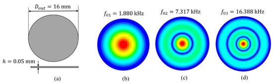 (a) Geometry used for the FEM modal analysis. (b–d) Contour plots of the first three axisymmetric vibrational modes estimated for the homogeneous thin plate.