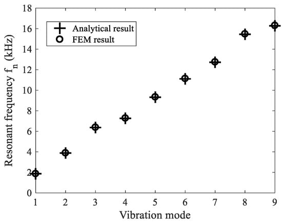For the first example, a numerical modal analysis on a stainless-steel circular thin plate was carried out. The mechanical properties of the plate are given in Table 1. In these calculations, 16,746 elements (SOLID186 with 20 nodes that exhibit quadratic displacement in ANSYS) were used. The boundary conditions of the thin plate were clamped at the edge to the piezoelectric ring, as is shown in Figure 3. Thus, the displacements in the circumferential area were assumed to be zero ( at ). The simulation was carried out using an FE model implemented in ANSYS; the pseudocode for the analysis is given in Appendix A. Figure 4 shows the results for the lowest axisymmetric modes when the largest displacement is at the center of the plate. To check the validity of the calculations, Figure 5 shows the first nine resonant frequencies using the modal analysis of a single, clamped, circular, and homogeneous thin plate. These results are compared with the theoretical approximation given by Equation (5). The results shows that the FE analysis only deviated by ~0.12% on average from the theoretical predictions.