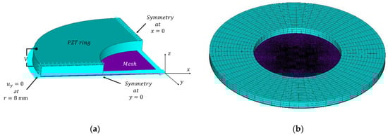 In a preliminary numerical harmonic analysis (see the description of the pseudocode in Appendix A), a stainless-steel circular thin plate coupled to a piezoelectric ring was modeled. The mechanical, piezoelectric, and physical properties of the materials are given in Table 1 and Table 2. The thin plate was modeled as a deformable plate using fully integrated elements with 20 nodes. Due to the symmetry of the model, only a one-quarter model was needed, thus reducing the number of grids and the overall computational demand (see Figure 6) [22].