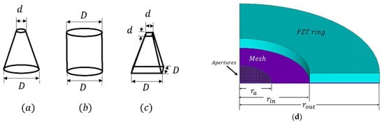Next, micro-apertures with three different geometrical shapes: cylindrical, pyramidal, and conical were added to the model of the circular thin plate to form a meshed thin plate (thin-plated with micro-apertures), which was then coupled to the piezoelectric ring. The meshed plate contained 551 micro-apertures with the dimensions shown in Figure 7, where d and . These were distributed over the thin plate following a rectangular array.