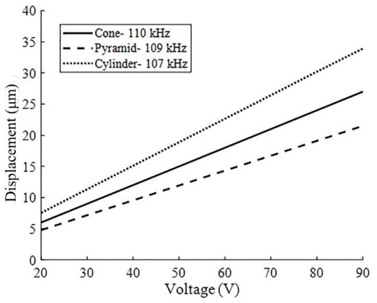 A forced harmonic analysis with a sinusoidal variation of the voltage was performed on this system as described in Figure 6. The resonant frequencies of the device and the maximum out-of-plane displacements of the mesh were recorded for the three micro-aperture shape geometries. Figure 8 shows a summary of results of the estimated out-of-plane displacement measured at the center of the thin plate against the voltage amplitude applied to the piezoelectric ring when the device was driven at the resonant frequency. The results indicate that the displacement increased linearly with the applied voltage for all three types of aperture shapes. The results show only a small change in the resonance frequency, which seems to be correlated to a loss of density due to the volume removed by micro-apertures in the thin plate, as predicted by the plate theory (Equation (5)). Thus, cylindrical openings with a constant diameter have the largest volume and, also, a resonance frequency, followed by the conical and pyramidal. However, in this work, our focus will be on the conical aperture because of the valveless pumping effect reported in the literature and its better atomization performance [23].