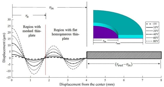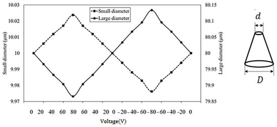 The volume generated by the global deformation of the thin plate , as well as the additional contribution of the micro-aperture deformations , were also numerically estimated. The maximum deformation of the micro-aperture located near the center of the thin plate was measured directly from FEM at 110 kHz for the values of the voltage in the range [−80, 80] V, as shown in Figure 14. A symmetric cyclic behavior of the small () and large ( diameters was found; however, these changes were very small (about 0.025 with respect to their initial value at rest. Thus, its contribution to the total value change was not found to be significant.