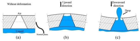 In Cai et al. [12], the atomization rate was studied, focusing on the effect of the volume change at the liquid chamber (container) due to the deformation of the thin plate during the vibrations at the lowest vibration mode. Additionally, the contribution by the small deformation of the micro-apertures of the mesh during the vibration to the mass flow was studied for that mode. This idea is illustrated in Figure 10, where the conical micro-aperture deforms by the global deformation of the thin plate. During the periodic vibration, any point on the non-neutral surface moves in two possible conditions. First, the point is bent in the upward direction and then is released back to equilibrium, followed by a compressed state to its lower limit and back to equilibrium. This mechanism acts as a micro-pump, promoting the generation of atomized drops [26].