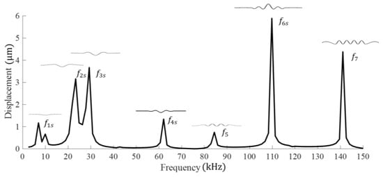 Numerical results of the frequency sweep for 20 V obtained by FEM. A schematic of the frequency mode cross-section is shown above every detected frequency.