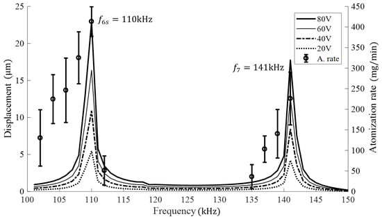 In Figure 13, the numerical simulation findings (line plots) at various voltage levels (20–80 V) are compared with the experimental results of the atomization rate obtained by a frequency sweep over the range from 100 kHz to 150 kHz. The small discrepancies were expected, as the PZT ring was bonded to the metal mesh using epoxy and the wires were soldered to the system. Overall, the peak atomization rates matched closely with the resonant frequencies from the numerical simulations, with the maxima occurring at frequencies around 110 kHz and 141 kHz. From these results, it is possible to observe that the resonance frequency is not altered with the voltage change; only the amplitude of the central displacement is affected.