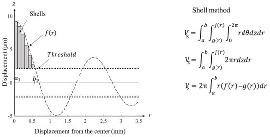 Additionally, the global liquid volume displaced by the thin plate was calculated based on the FEM results (Figure 15). The distribution of the particle displacement at the surface of the thin plate as given by the FEM was calculated by using the shell method of integration [28]. An illustration of the integration method considering the limits (, ) is described in Figure 15. This method allows obtaining volumes generated by rotating an area between any two functions, and , where is the displacement curve and is a threshold.